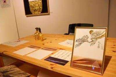 전시장 한쪽에는 작가가 실제 사용하는 책상이 놓여 있습니다. 작품명도 ‘L의 책상’입니다. 평소 스케치한 작품부터 개금작업 중인 조형물, 관람객들에게 증정한 금박 팬아트 사인 작품까지 깔끔하게 정리된 작가의 책상이 인상적입니다. 작가에게는 더할 나위 없이 소중한 공간입니다.