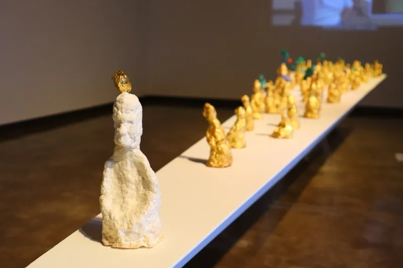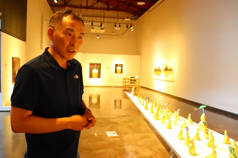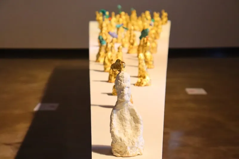 “이들은 어디론가 가는 것이다. 앞에 서 있는 건 이 무리의 대장이라고 할 수 있어 금을 씌우지 않았다. 사실 코로나 초창기 때 이 작품을 금호미술관에서 전시했다. 굉장히 반응이 좋아 칭찬을 많이 받았다. 그런데, 그 시기에 갑자기 대구 신천지 코로나 사건이 터져 전시장이 문을 닫게 되었다. 창고에 있었던 이 작품이 다시 나오기까지 관장님의 지지와 주변의 응원이 큰 도움이 되었다. 사실 옥천골 미술관이 아니면 이 작품을 전시하기 힘들었을 것이다. 이 작품은 공간이 확보가 안 되면 전시하기가 안 된다. 옥천골 미술관이 너무나 적합한 장소이다. 미술관에서 영상도 제작해주셔서 너무 고마울 따름이다”