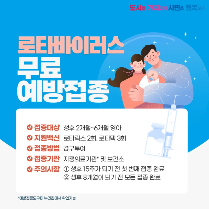 영유아 로타바이러스 백신 무료 접종 안내 닫기 ‣ 사업 시작일: 2023년 3월 6일(월)부터 ‣ 지원대상: 생후 2~6개월 영아 ‣ 지원백신: 로타릭스(2회), 로타텍(3회) ‣ 접종기관: 지정의료기관 및 보건소 ※ 로타 백신 종류별 지정의료기관은 2.27(월)부터 확인 가능 ※ 지정의료기관에서 접종 시 비용지원 가능 ‣ 접종가능 연령: ① 생후 15주가 되기 전까지 첫 번째 접종 완료 ② 생후 8개월이 되기 전 모든 접종 완료 ※ 접종일정은 예진의사와 상담 필요 자세한 내용은 보도자료를 참고하시기 바랍니다. ※ (경로) 해당 누...
