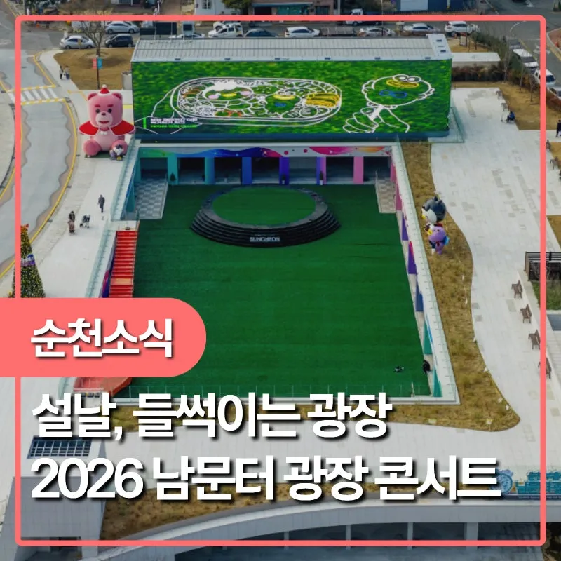 2026년 설 연휴, 남문터광장으로 놀러오세요! 아이들이 즐길 수 있는 다양한 체험 프로그램부터, 어른들도 참여할 수 있는 설날 가요제까지! 설 명절을 맞아 가족, 이웃과 함께 남문터광장에서 들썩! 들썩! - 행사 일시 : 2026. 2. 15.(일) ~ 17.(화) 11:00 ~ 17:00 (설연휴 3일간 운영) - 장소 : 순천부 읍성 남문터광장 - 사전접수 기간 : 2026. 2. 5.(목) ~ 2. 11.(수) 18:00 ※ 접수 인원 초과 시 조기 마감될 수 있습니다. ※ 사전접수자에 한하여 경품 응모권이 제공됩니다. ⭐월...