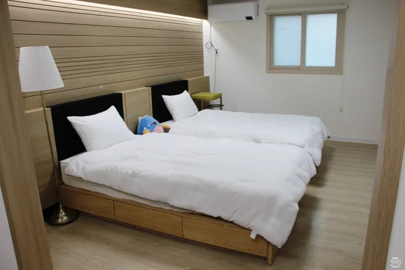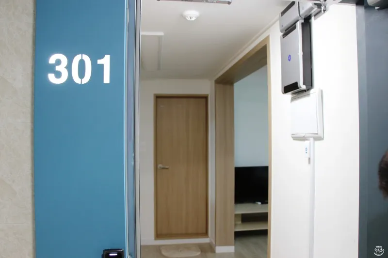 301호와 303호는 더블베드가 놓인 2인실입니다. 그 외의 어메니티나 구성은 모두 비슷하고 마치 호텔과 같은 느낌입니다.