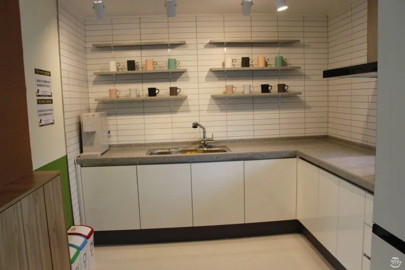 간단한 음식을 해먹을 수 있는 공유 주방을 비롯하여, 혼자서 식사가 가능한 공간과 휴게 시설이 마련되어 있습니다.