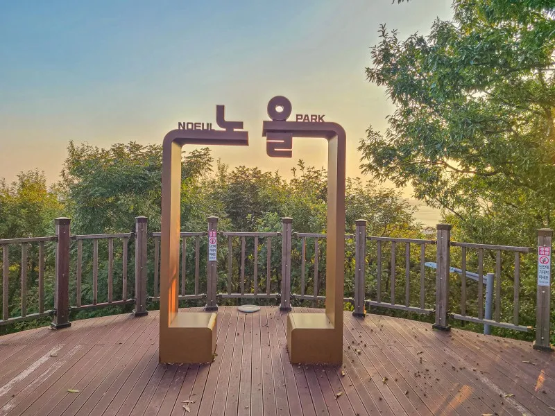 노을 포토존도 있어서 사진을 찍어볼 수 있었습니다. 정상에 이렇게 전망 데크와 의자, 포토존 등이 예쁘게 조성되어 있어서 쉬면서 조망하기도 더욱 좋았습니다. 노을공원 해질 때 방문하시는 분들은 정상 와보시는 것을 추천드려요.