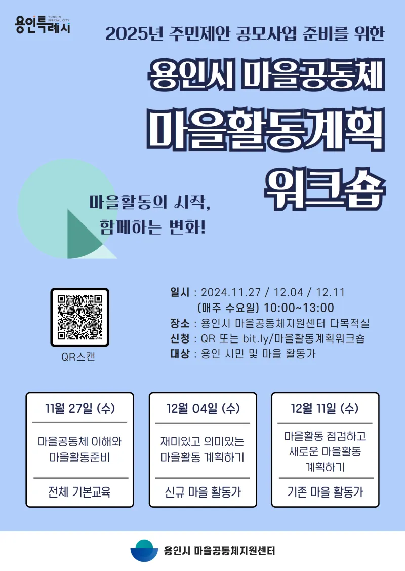 2025년 주민제안 공모사업 준비를 위한 용인시 마을공동체 마을활동계획 워크숍을 아래와 같이 진행합니다. ★ 일 시 : 11.27 / 12.04 / 12.11 매주 수요일 10시~13시(3시간) ★ 대 상 : 용인 시민 및 마을활동가 ※신규 마을 활동가 - 11월27일/12월4일 ※기존 마을 활동가 - 11월27일/12월11일 ★ 장 소 : 용인시 마을공동체지원센터 다목적실 ★ 문 의 : 031-335-1070 *상기 일정은 센터사정에 따라 변경될 수 있습니다.