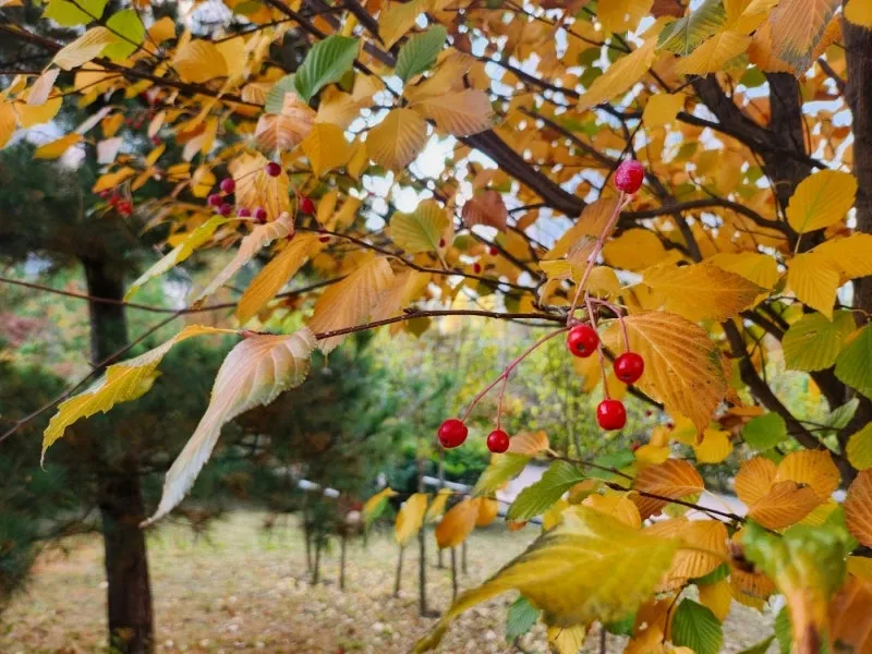 양지근린공원은 산책로를 따라 느티나무, 팥배나무, 단풍나무, 화살나무 등이 식재되어 있는데요. 봄에는 연두빛으로, 여름에는 초록빛으로 계절이 오고 감을 알려줬던 나뭇잎들이 노랑, 주황, 빨강으로 변신했어요. 푸바오가 좋아한다는 남천은 잎사귀만 빨갛게 물든 게 아니라 콩알 같은 열매까지 빨갛게 익어갑니다.