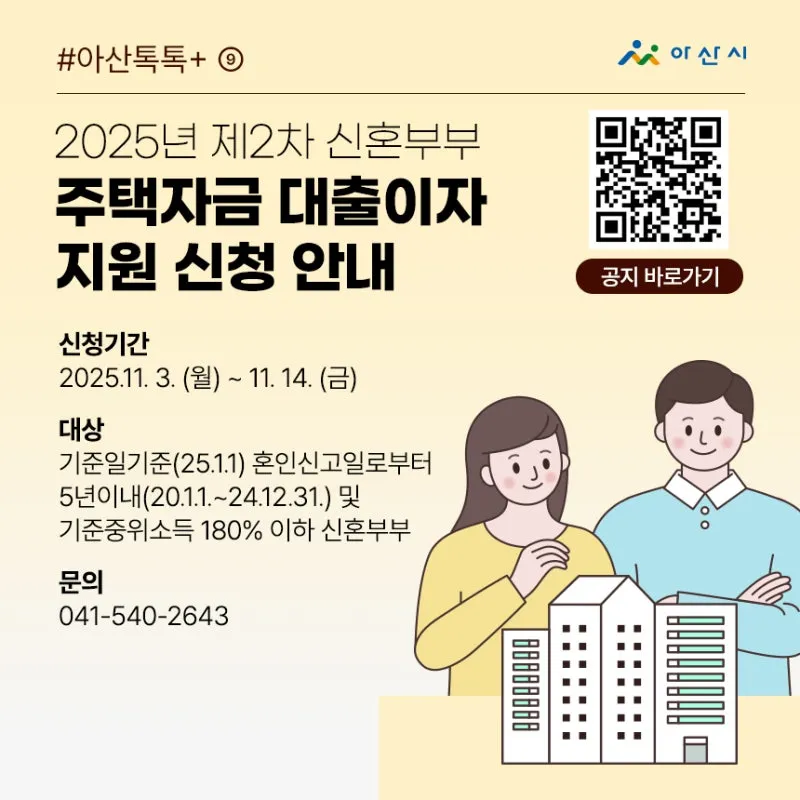 ▣ 신청기간: 2025. 11. 3. (월) ~ 11. 14.(금) ▣ 지원대상: 혼인기간 5년(2020.1.1.~2024.12.31.)이내 중위소득 180% 이하 신혼부부 - 연령제한 없음, 신청일 기준 부부 모두 아산시에 주민등록 두고 거주하고 있는 신혼부부 - 1주택자 또는 전월세 거주 무주택자 (예) ①1주택자 : 부부 중 1인 소유의 주택에 거주 ②전월세 거주 무주택자 : 부부 모두 무주택이며 전월세로 거주하는 주택 (전월세로 거주하며 분양권 취득했으면 해당 되지 않음, 전월세 거주하는데 부부 중 한...
