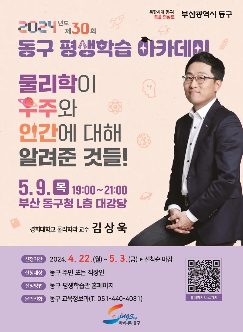 Home > 평생학습 > 강좌상세조회 및 신청 강좌상세조회 및 신청 평생학습 강좌신청 - 교육신청 글쓰기 : 강좌명, 강좌시작일, 강좌종료일, 접수시작일, 접수종료일, 교육요일,교육시간, 교육정원, 대기가능정원, 교육장소, 교육문의전화,강사명, 수강료 강좌구분 동구 아카데미 강좌명 제30회 동구 평생학습 아카데미(김상욱 교수_물리학이 우주와 인간에 대해 알려준 것들) 강좌내용 교육일시 : 2024. 5. 9.(목) 19:00~21:00 교육장소 : 동구청 L층 대강당 교육대상 : 동구 주민 및 직장인 초청명사 : 김상욱 교수(경희대...