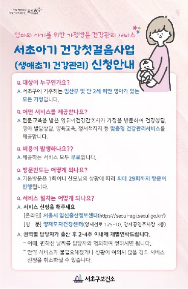 · 지원대상 : 서초구 거주 임산부 및 만 2세 미만 영아가 있는 가정