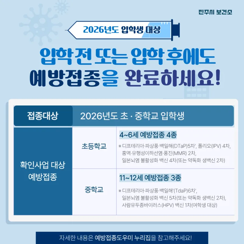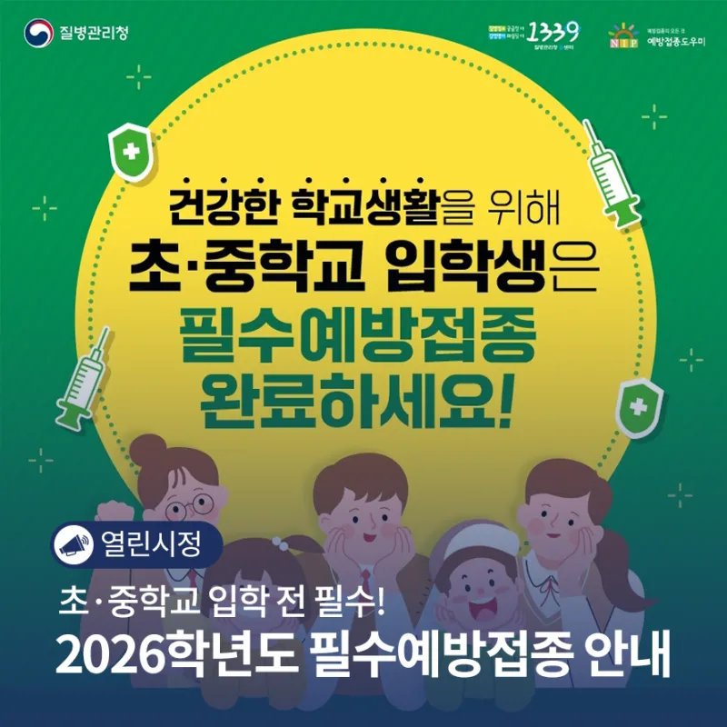 💉 2026학년도 초·중학교 입학생 필수예방접종 항목 🎒 초등학교 : 4~6세 예방접종 4종 〰️ 디프테리아·파상풍·백일해'(DTaP)5차' 〰️ 폴리오(IPV) 4차 〰️ 홍역·유행성이하선염·풍진(MMR) 2차 〰️ 일본뇌염 불활성화 백신 4차 (또는 약독화 생백신 2차) 🎒 중학교 : 11~12세 예방접종 3종 〰️ 디프테리아·파상풍·백일해'(TDaP)6차' 〰️ 일본뇌염 불활성화 백신 5차 (또는 약독화 생백신 2차) 〰️ 사람유두종바이러스(HPV) 백신 1차 (여학생 대상) |