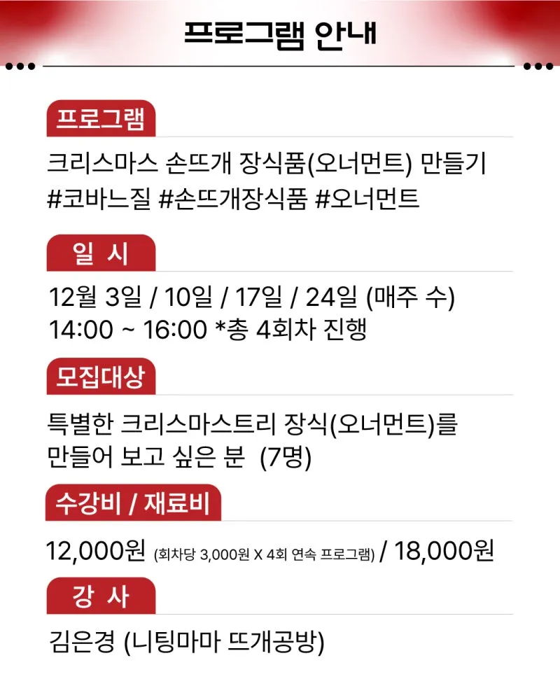 명덕생활문화센터, 손뜨개로 만드는 크리스마스트리 장식 클래스