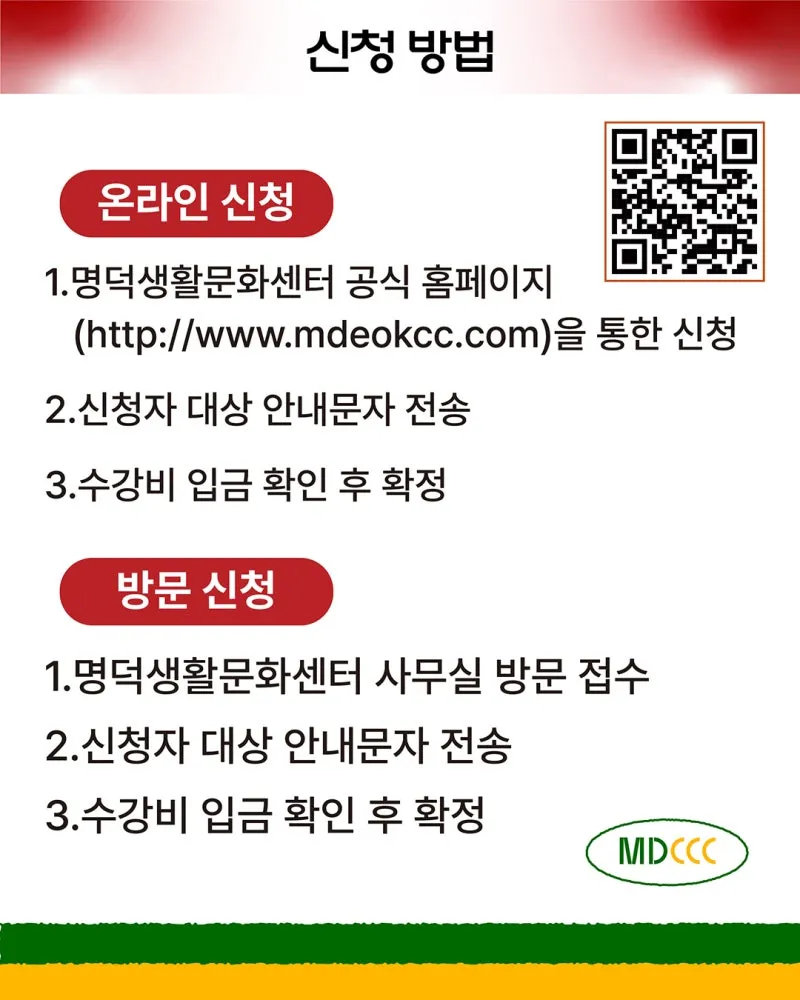 ◆ 신청ㅣ명덕생활문화센터 홈페이지 http://www.mdeokcc.com