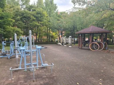 은행마을공원은 다른 근린공원들과 크게 다르지 않았습니다. 크지 않은 규모의 공원에는 팔각정 쉼터와 운동기구들, 공원 한 바퀴를 돌 수 있는 산책로 등이 마련됐습니다.