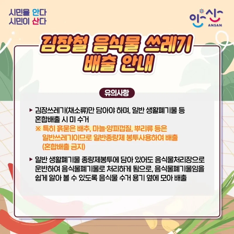 ※ 특히 흙묻은 배추, 마늘·양파껍질, 뿌리류 등은 일반쓰레기이므로 일반종량제 봉투사용하여 배출(혼합배출 금지)