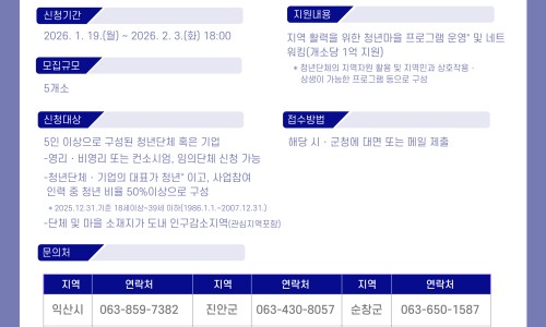 2026년 전북 청년마을 만들기 사업 | 2026. 1. 19.(월) ~ 2. 3.(화) 18:00까지