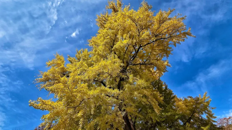 가을이면 가지 끝까지 노랗게 물들며 파란 하늘과 대비되어