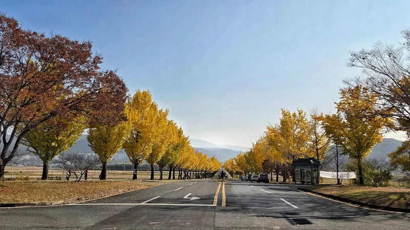 줄지어 선 은행나무가 일제히 노랗게 물들며