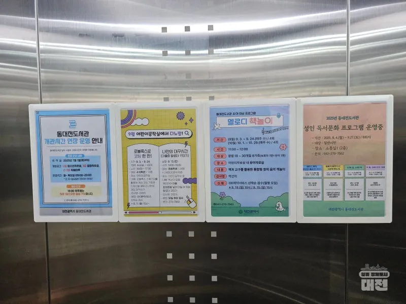 엘리베이터에는 이번 8월에 운영하는 프로그램들을 소개하고 있었는데요. 어린이를 위한 추천 도서를 비롯해, 멜로디 책노리라는 주제로 유아 대상 가족 체험 프로그램이 마련되어 있었어요. 성인 독서 문화 프로그램도 운영 중이라고 하니 관심 있는 분들은 동대전 도서관 홈페이지를 통해 정보를 얻어 보시면 좋을 것 같습니다.