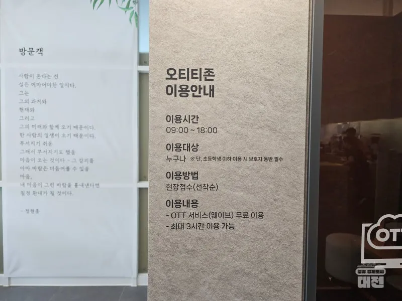 동구에 사는 청소년 친구들은 너무너무 좋겠다는 생각이 들었답니다. 새로 생긴 도서관답게 OTT서비스인 웨이브를 무료 이용할 수 있는 공간도 있었는데요. 초등학생의 경우 보호자 동반하여 사용이 가능했어요. 4개의 공간으로 되어 있는 OTT존은 기존 도서관의 틀을 깬 공간이라 신기했답니다. 현장접수를 통해 최대 3시간까지 이용가능하다고 하니 더운 여름방학 이곳에서 가족과 푹신한 빈백에 누워 웨이브를 즐겨보는 것도 좋을 것 같습니다.