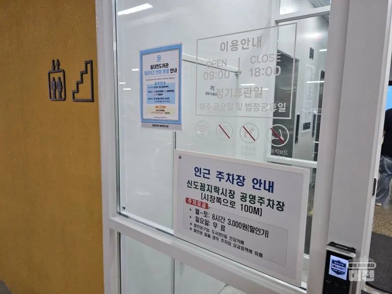 도서관 인근에 주차 가능하지만 신도 꼼지락 시장 공영주차장에도 주차가 가능하답니다. 8시간 3,000원 할인가로 이용가능하고 일요일은 무료 주차 가능하니 참고해 주세요. 대중교통으로 이용하면 더욱 좋겠죠?