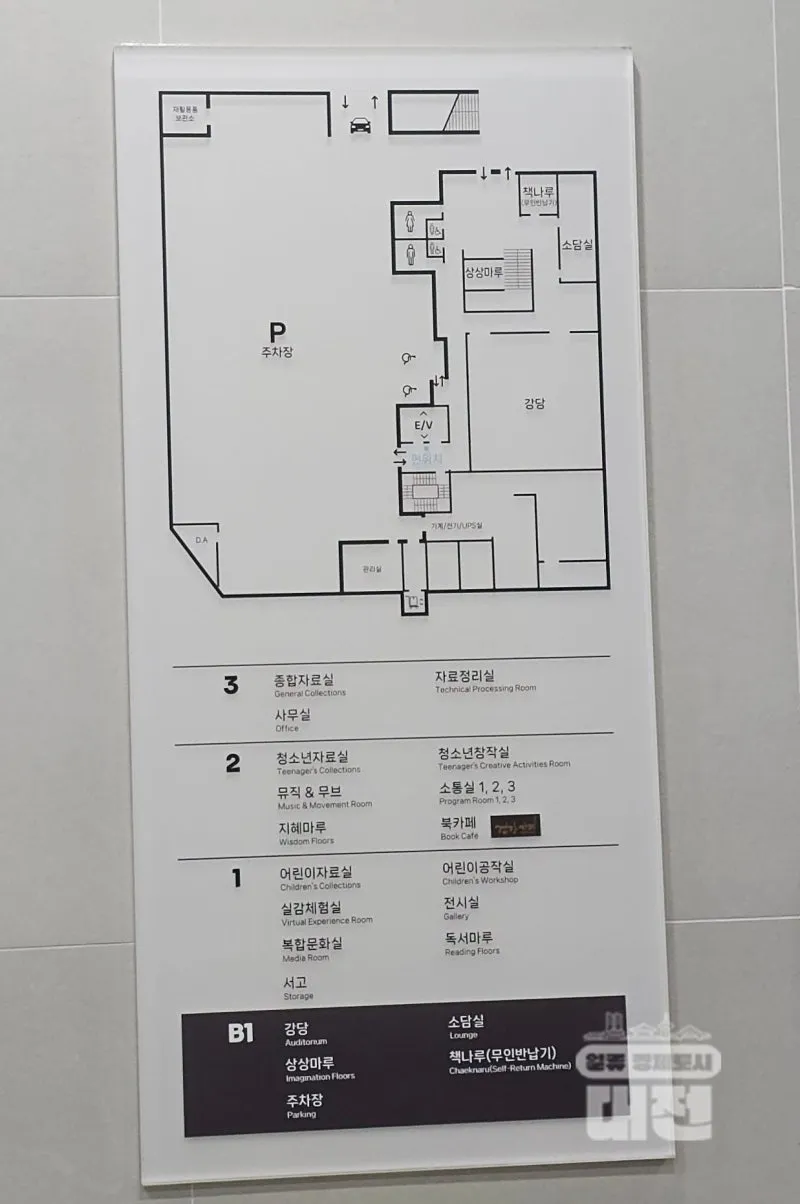 지하 1층부터 지상 3층까지 이루어진 동대전 도서관은 지하 1층에는 강당, 주차장, 상상마루, 소담실, 무인반납기(책나루) 1층에는 어린이자료실, 실감체험실, 전시실, 복합문화실, 독서마루, 서고가 위치해 있답니다. 2과 3층은 청소년 자료실과 종합자료실, 사무실로 이루어져 있었습니다. 계단을 이용하시면 편리하게 이용 가능하지만 엘리베이터도 있었어요.