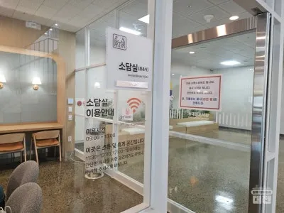지하 1층에는 휴식을 취할 수 있는 '소담실'도 있었는데요. 간단한 간식과 도시락을 먹을 수 있는 공간으로 되어있었어요. 책을 오래 길게 읽고 싶은 분들은 11:30 - 13:30 , 17:00 - 18:00에는 식사 이용이 가능하니 참고해 주세요. 공간이 꽤 넓었답니다. 식사 이용은 가능하지만 국물이 있는 라면류 반입은 안된다고 해요. 식사 중에도 조용히 이용해야 한다는 점도 참고해 주세요.
