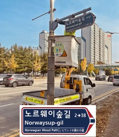 도로명판은 로마자 표기(Norwaysup-gil)을 기본으로, 영어·일본어·중국어 번역 표기와 함께 노르웨이 국기 문양을 넣어 국제적 의미를 살렸습니다.
