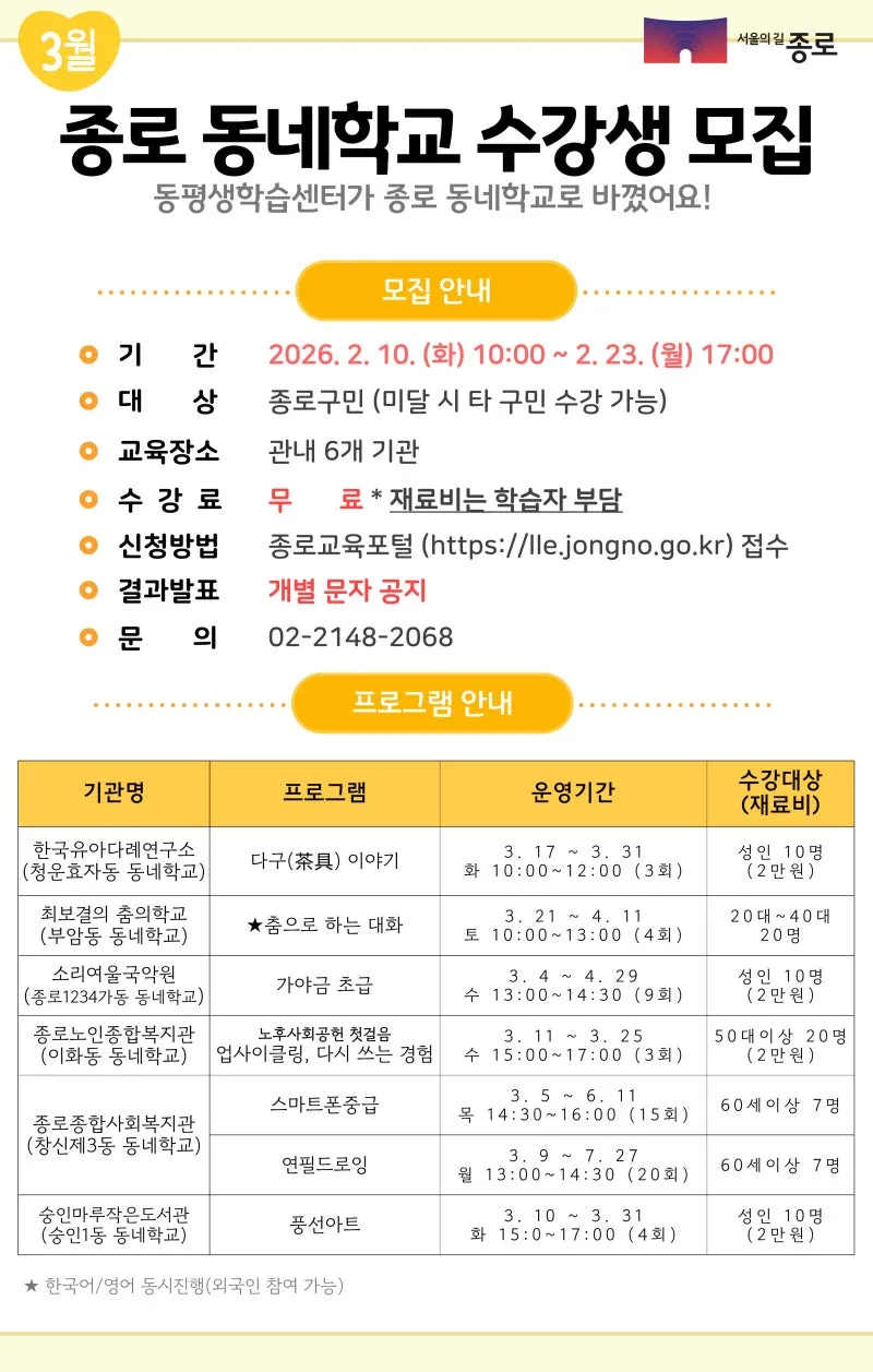 ☑️문 의: 종로구 평생교육과 ☎ 02-2148-2068