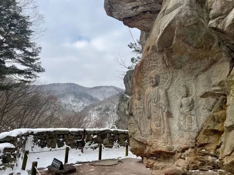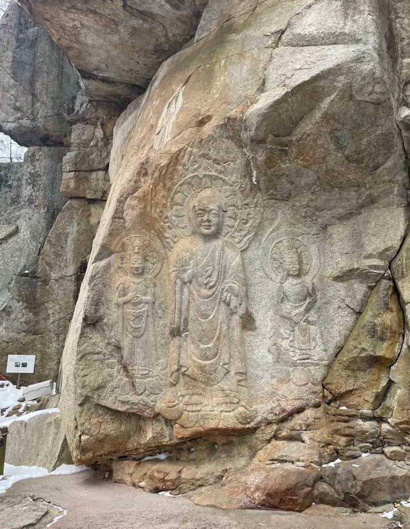 (마애불이란? 자연 암벽에 선을 새기거나 도톰하게 다듬어 만든 불상입니다)