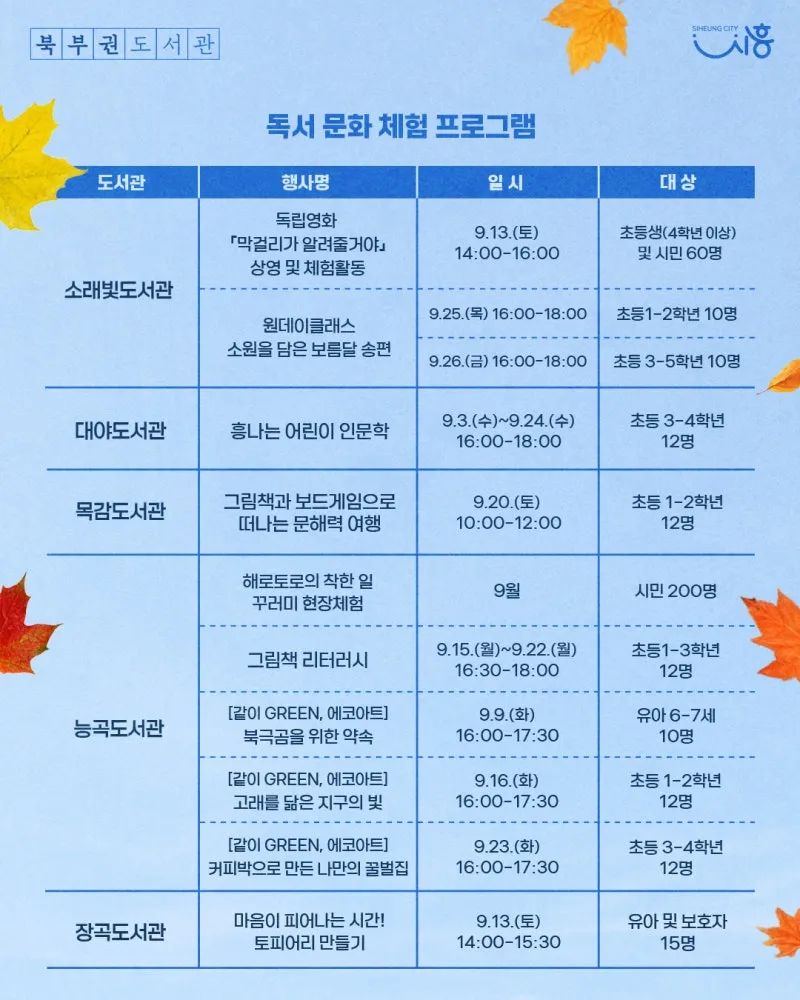 시흥시 소래빛도서관을 비롯한 북부권 8개 공공도서관이 ‘9월 독서의 달’을 맞아 9월 한 달간 시민의 독서문화 환경을 조성하는 20개의 문화행사를 운영합니다.