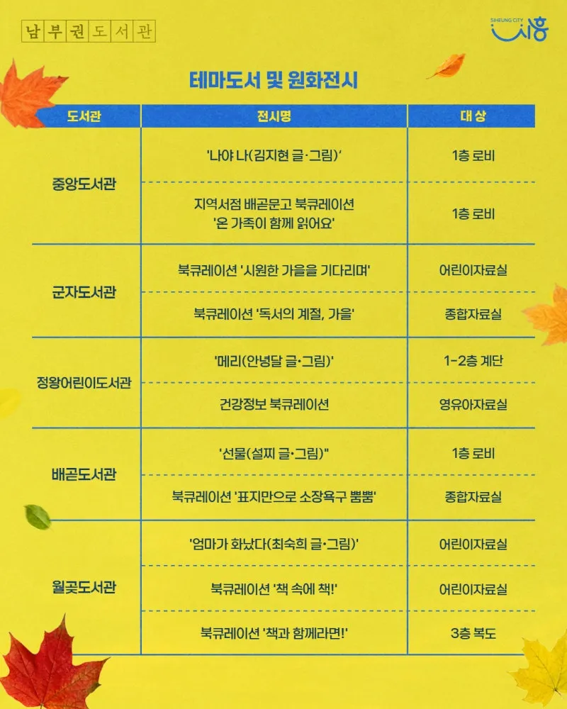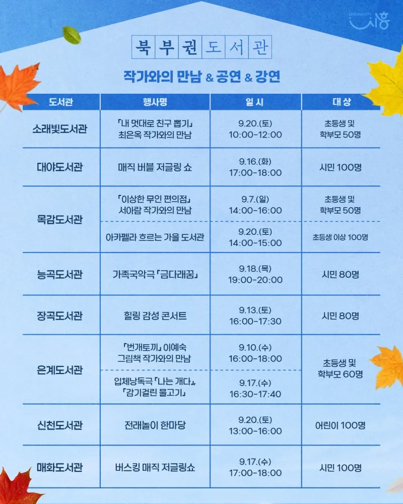 공연 및 문화예술프로그램은 ▲소래빛도서관 ‘독립영화 「막걸리가 알려줄거야」 상영’ ▲대야도서관 ‘매직 버블 저글링쇼’ ▲목감도서관 ‘아카펠라 흐르는 가을 도서관’ ▲능곡도서관 ‘(가족국악극)금다래꿍’ ▲장곡도서관 ‘힐링 감성 콘서트’ ▲은계도서관 ‘입체낭독극「나는 개다」, 「감기 걸린 물고기」’ ▲매화도서관 ‘버스킹 매직 저글링쇼’가 준비돼 일상에서 다양한 프로그램과 함께 도서관이 제공하는 새로운 즐거움과 감동을 만끽할 수 있을 것으로 기대됩니다.