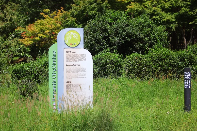 허황옥 상 옆 징군수는 장군차 나무입니다.