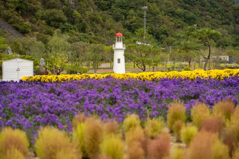 아스타국화와 노란 국화 너머에는 등대도 보여요!
