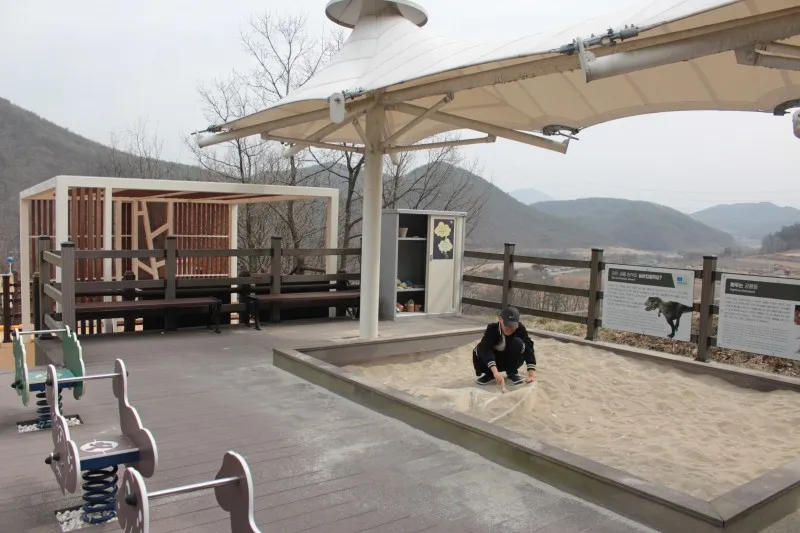 공룡모양의 흔들의자와 화석발굴체험장이 마련되어 있어요.