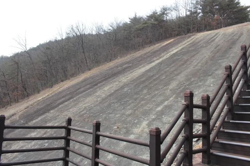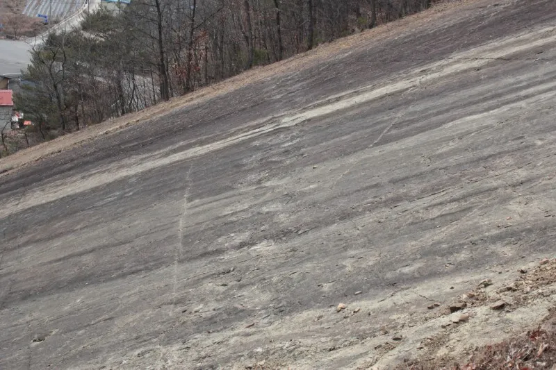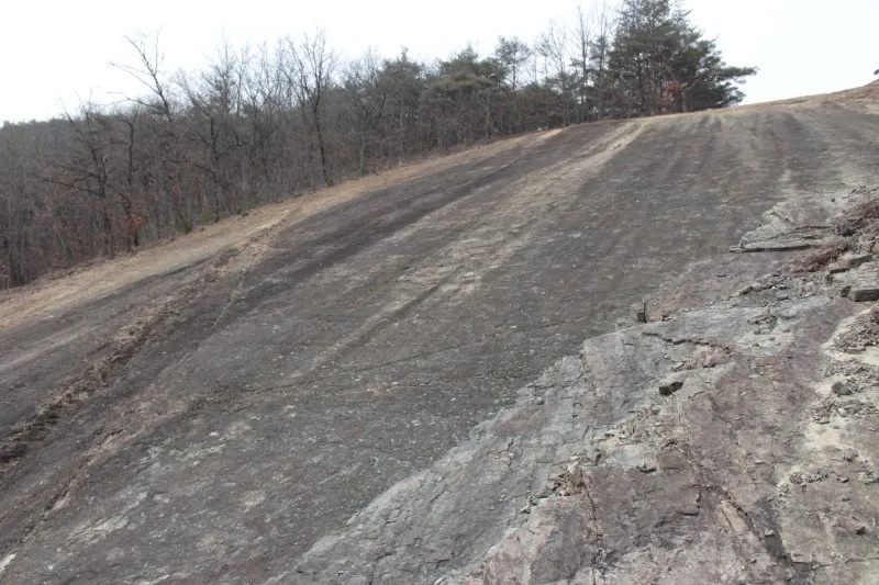 산 절벽에 형성된 신성리 공룡발자국 화석이에요.