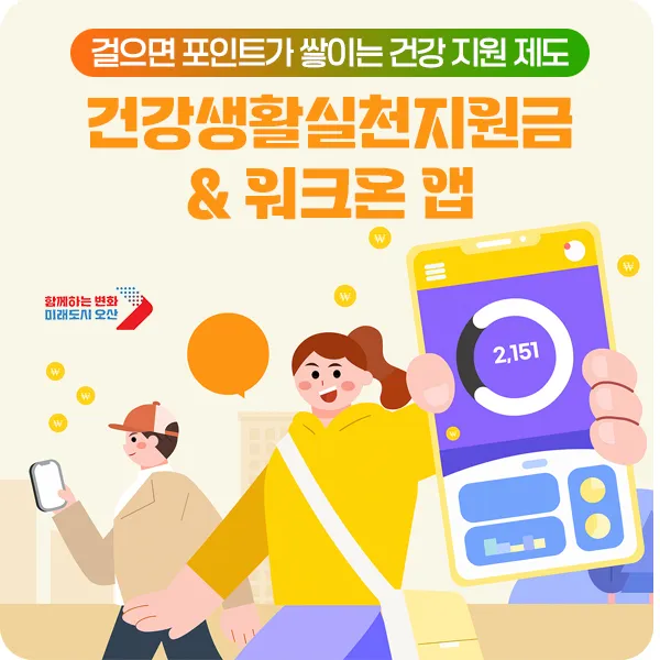 바로 보건복지부의 <워크온>과 국민건강보험공단이 주관하는 <건강생활실천지원금제>인데요. 오산시민 여러분도 참여할 수 있는 건강 인센티브 제도를 알려드려요!
