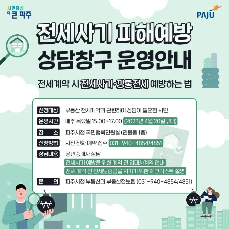 ✅신청대상|부동산 전세계약과 관련하여 상담이 필요한 시민 ✅운영시간|매주 목요일 15:00 ~ 17:00 (2023. 4. 20.부터) ✅장소|파주시청 국민행복민원실(민원동 1층) ✅신청방법|사전 전화 예약 접수(031-940-4854/4851) ✅상담내용|공인중개사 상담 - 전세사기 예방을 위한 계약 전 임대차계약 안내 - 전세 계약 전 전세보증금을 지키기 위한 체크리스트 설명 ☎ 문의 파주시청 부동산과 부동산정보팀 031-940-4854/4851 |