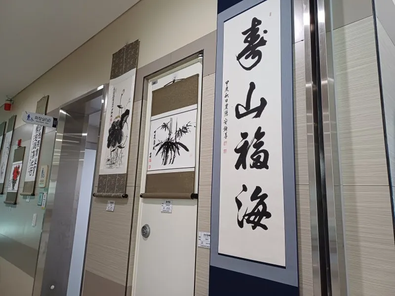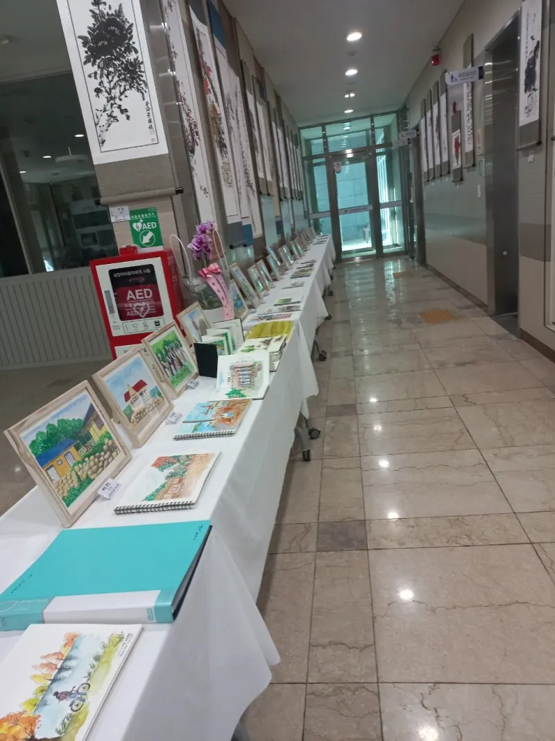 서예문인은 복도 양쪽 벽에 전시되어 있고 그 아래에 어반 스케치 작품들이 있습니다.