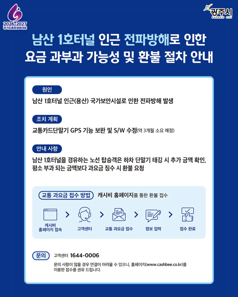 남산1호터널 경유노선 버스요금 과부과 가능성 및 환불절차 안내