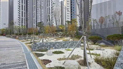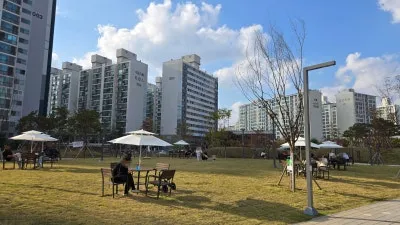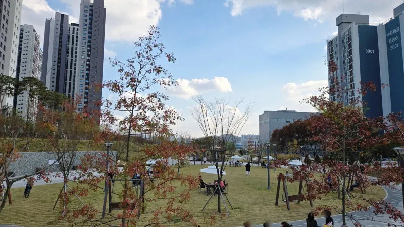 높은 아파트 건물 사이에 탁 트인 공원이 조성되어