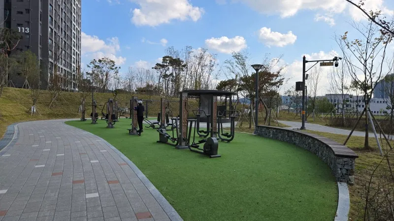 초록으로 가득 찬 공간에 다양한 체력 단련 시설을 배치하여