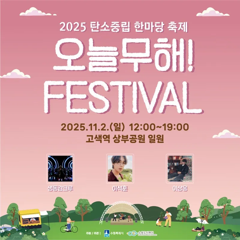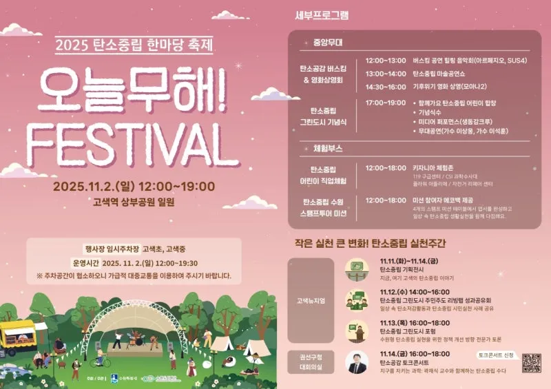 < 탄소중립 한마당 축제 "오늘무해! 페스티벌" > 0. 일 시: 2025. 11. 2.(일) 12:00~19:00 *탄소중립 그린도시 기념식: 17:00~19:00 0. 장 소: 고색역 상부공원 0. 주 제: 지구로운 일상, 무해로운 삶 0. 주요내용 - (공식행사) 개막식, 탄소중립 그린도시 미디어 퍼포먼스, 기념식수, 유공자표창 등 - (무대공연) 오프닝공연(탄소중립송 합창공연), 본공연(대중가수 초청공연) - (기획행사) 탄소공감 버스킹&영화상영회, 탄소중립 어린이 직업체험, 탄소중립 스탬프투어 - (체 험) ‘그린 캠크닉존...