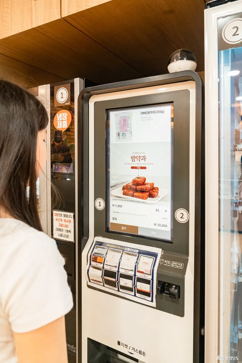 넓고 깔끔한 공주알밤센터의 실내에는 자판기가 마련되어 있는데, 이곳에서는 공주의 특산물인 알밤으로 만든 다양한 음료, 간식, 주류 등이 마련되어 있습니다.