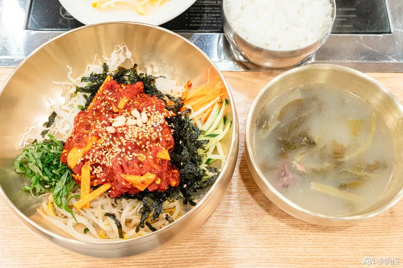 공주 맛집 시장정육식당의 하이라이트는 뭐니뭐니 해도 이 육회비빔밥이라 할 수 있겠는데요. 알밤이 가득 들어가 있는 육회 비빔밥은 씹을 때마다 알밤이 오독오독 씹히면서 색다른 식감을 자랑합니다. 갖은 야채와 매콤한 고추장 양념이 잘 어우러져 별미 중의 별미인데 개인적으로 함께 나오는 국은 선지국이라 저는 선지를 먹지 못하는 관계로 조금 아쉬웠던 것 같습니다.