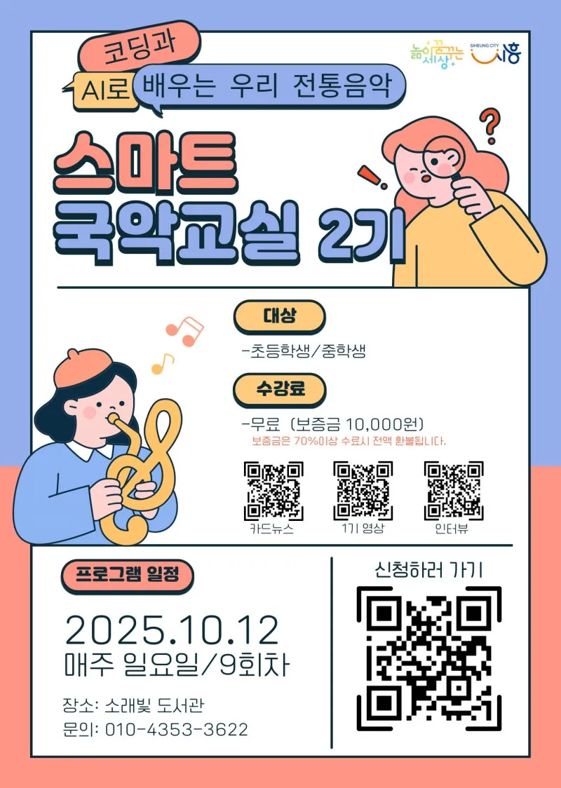 이 프로그램은 블록코딩과 인공지능(AI)을 접목해 국악기를 직접 제작하고 연주할 수 있도록 구성됐습니다. 어린이와 청소년들에게 전통음악과 디지털 융합 경험을 동시에 제공하는 과정으로, 지난 여름방학 특강에서도 참여 학생들의 큰 호응을 얻은 바 있습니다.