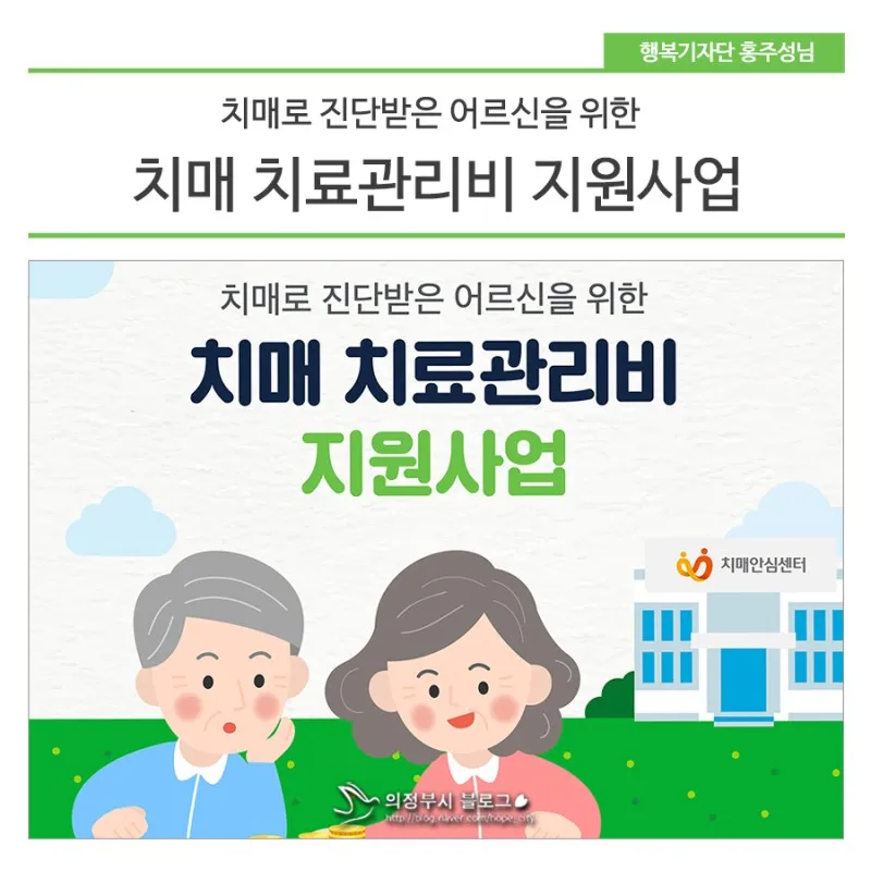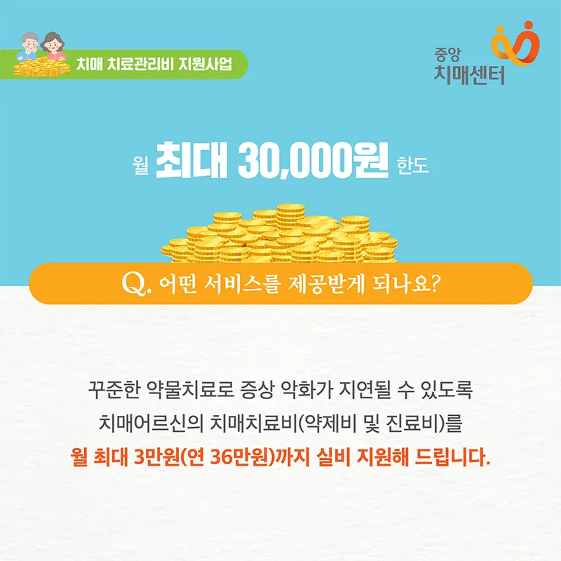 - 지원범위: 치매치료관리비 본인부담금 (치매약제비 본인부담금+약 처방 당일의 진료비 본인부담금)
