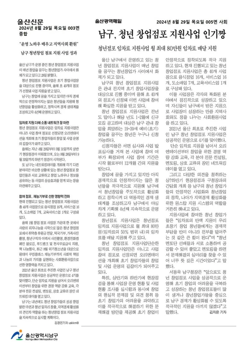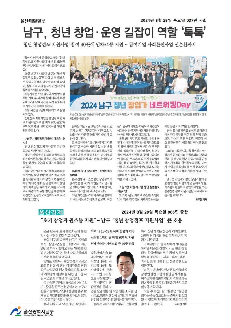 {"title":"[행복남구 오늘의신문] 청년 창업가를 위한 길잡이가 되겠습니다 🪧 (8월 29일 목요일)","source":"https://blog.naver.com/ulsan-namgu/223565243507","blogName":"울산광역시..","blogId":"ulsan-namgu","domainIdOrBlogId":"ulsan-namgu","nicknameOrBlogId":"울산광역시남구","logNo":223565243507,"smartEditorVersion":4,"meDisplay":true,"lineDisplay":true,"outsideDisplay":false,"cafeDisplay":false,"blogDisplay":false}