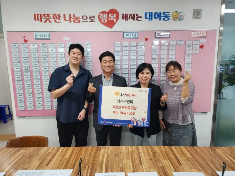 대야동 마을자치관계자는 “추석을 맞아 따뜻한 나눔을 실천해 주신 ㈜성진씨앤티와 한성운 대표에게 깊이 감사드린다”라며 “기탁해 주신 백미는 대야동의 어려운 이웃들을 위해 잘 사용하겠다”라고 밝혔습니다.