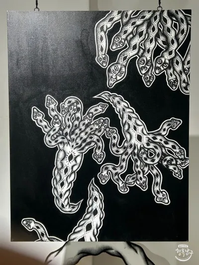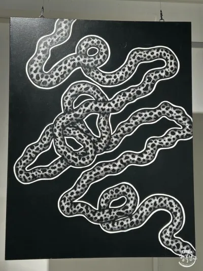 작품을 사각 캔버스에서 확장하여 어디든지 세워둘 수 있는 나무판을 제작하여 뱀을 형상화한 작품도 볼 수 있습니다.