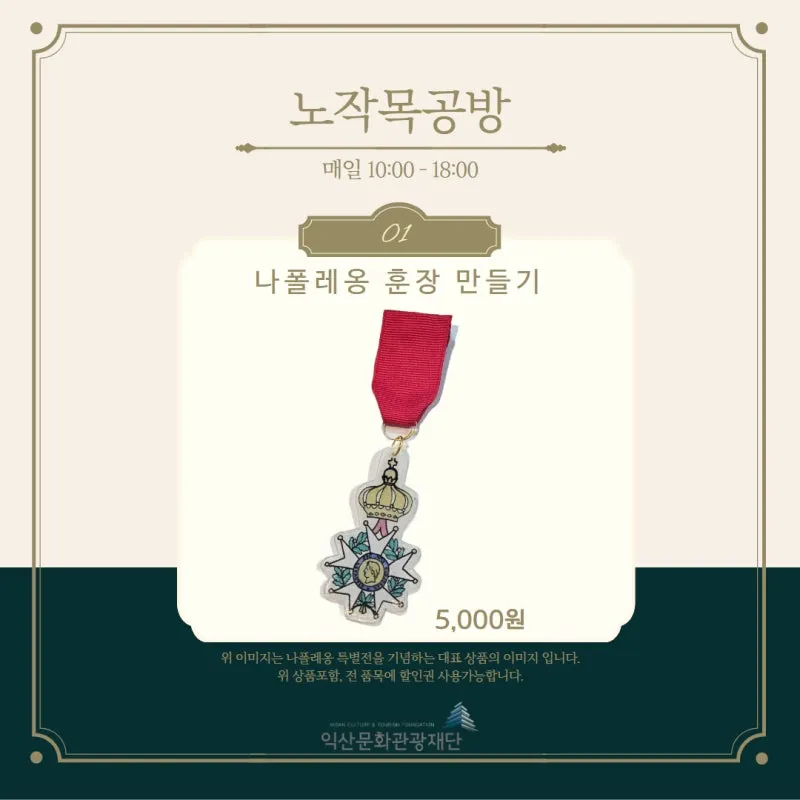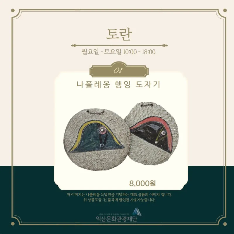 방문해주셔서 감사합니다. 나폴레옹 갤러리 유물 익산 특별전을 기념하여 진행되는 익산 문화예술의 거리 체험 프로그램 예약을 위한 폼입니다. 📅기간 : 2024. 5. 20. ~ 6. 30. 🚩프로그램 장소 : 노작목공방, 모꼬지공방, 카페 청가람, 카페 탐탐앤옹이, 토란 📌본 예약폼은 예약자 정보를 수집하기 위한 수단으로, 예약폼만으로는 예약 확정이 되지 않습니다. 예약폼 확인 후, 기입해주신 연락처로 안내를 드릴 예정입니다. 📞문의 : 063-843-8812 익산문화관광재단 관광마케팅팀