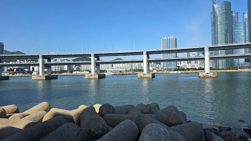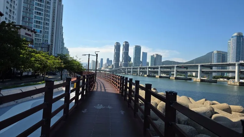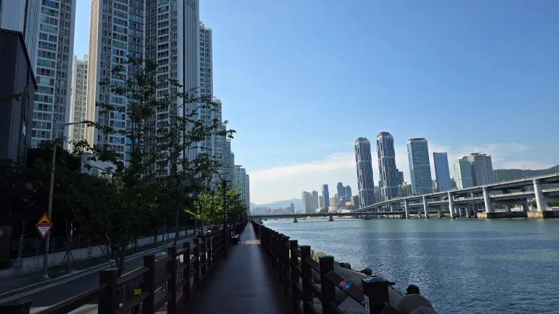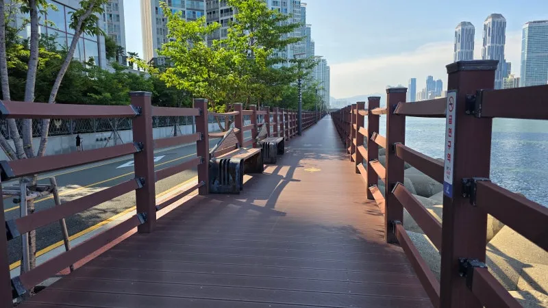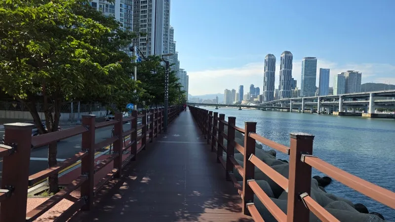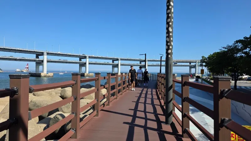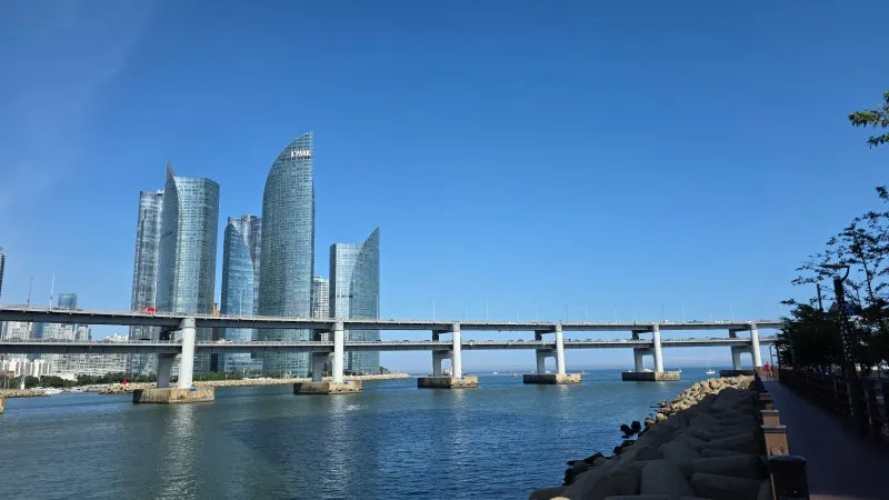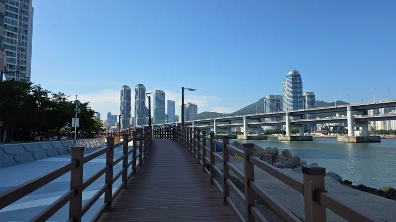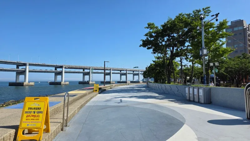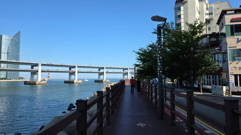 낮의 민락수변공원은 조용한 힐링 공간으로, 차분하고 여유롭게 바다를 감상하기 좋은 분위기를 선사해 주는데요, 하늘과 바다가 맞닿은 듯한 풍경을 바라보며 걷다 보면, 부산 수영구 힐링 여행지로서의 가치가 절로 느껴집니다.